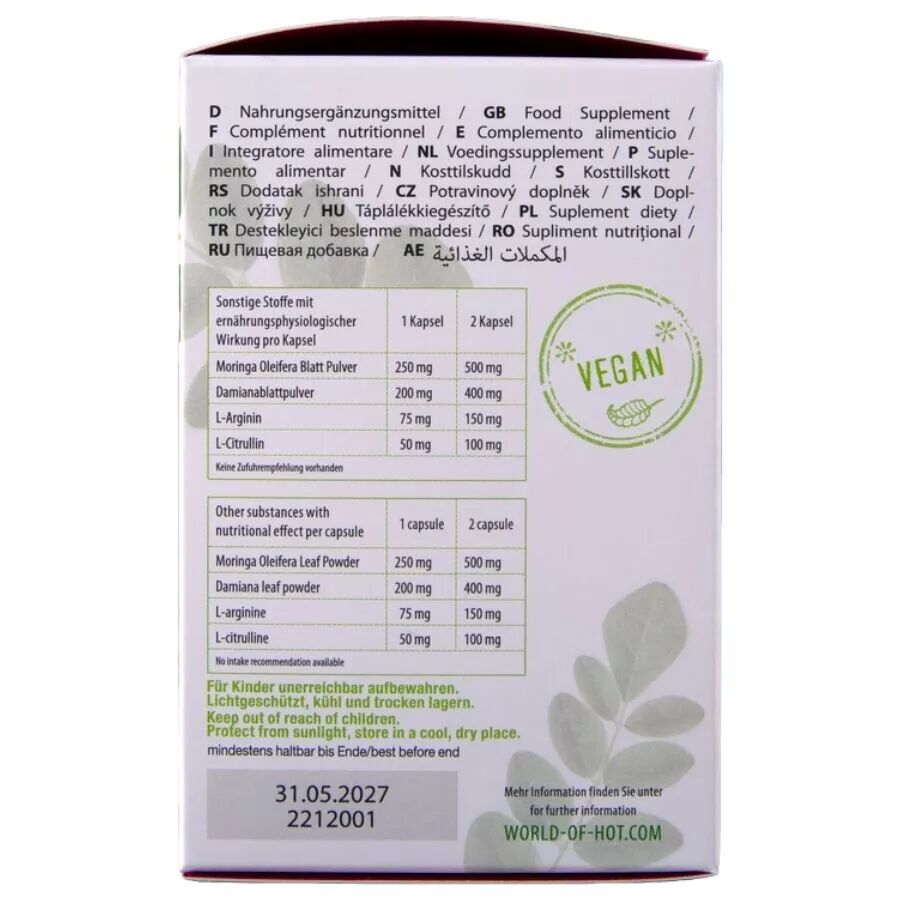Poudre de Moringa Oleifera*, poudre de feuilles de Damiana (Turnera Diffusa), capsule : (gant de placage : E 464, agent colorant : E141), 11 % L-Arginine, L-Citrulline, stéarate de magnésium (agent de séparation).
