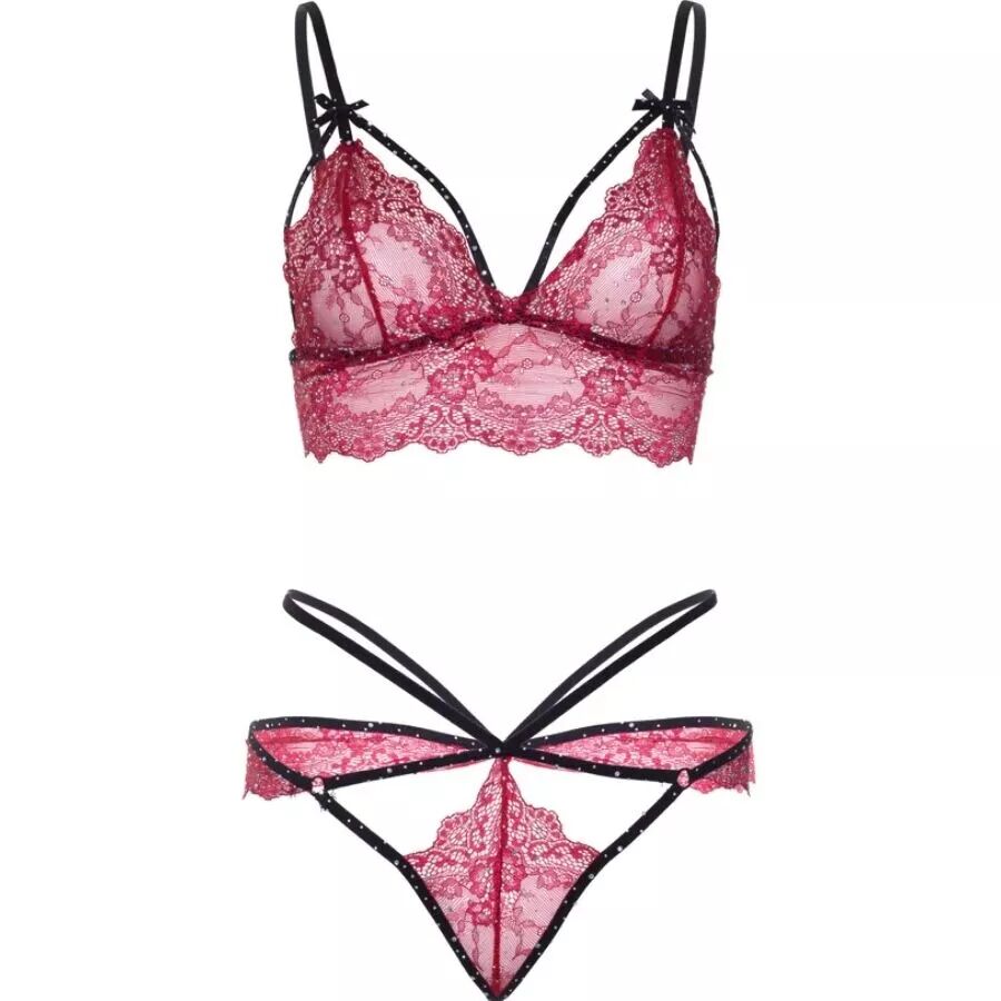 Le string assorti, orné lui aussi de fines lanières, complète à merveille la brassière, créant un équilibre parfait entre délicatesse et audace. Sa coupe sublime naturellement vos courbes, tandis que la dentelle douce offre confort et une finition impeccable. Cet ensemble est idéal pour celles qui recherchent une lingerie raffinée et audacieuse, rehaussée d'une touche d'éclat.