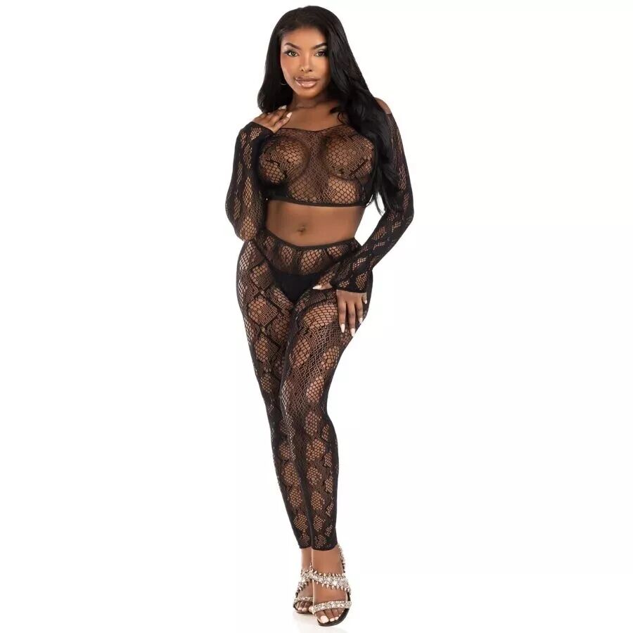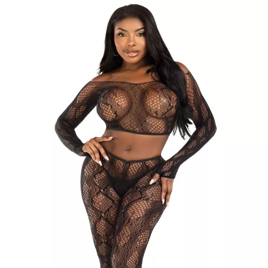 Faites sensation avec cet ensemble en dentelle extensible et résille à motif peau de serpent. Il comprend un crop top à manches longues épaules dénudées et un legging taille haute sans pieds, tous deux confectionnés dans un tissu doux et extensible qui épouse les formes pour une silhouette audacieuse et sensuelle. Idéal pour une soirée intime ou un festival, surtout porté avec un short ou une jupe.