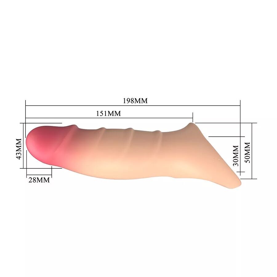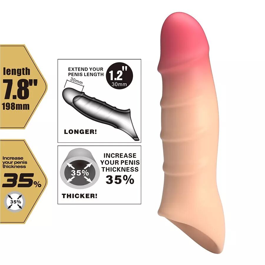 Cet accessoire s'adapte à votre anatomie pour augmenter la taille, vous permettant de ressentir un contact maximal grâce à son canal interne lisse qui épouse votre érection, tandis que son extérieur aux veines réalistes masse l'intérieur de votre partenaire.